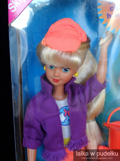 Podobnie jak reszta paczki "Skipka" zapakowana jest w różowe pudełko "pinkbox" z niebiesko-zieloną tekturką, na której tle prezentuje swoje wdzięki. Produkt ma już 25 lat, a nadal wygląda jak nówka, zarówno pudełko jak i jego zawartość, Cieszę się, że istnieje na rynku tak wiele produktów NRFB dzięki temu można się poczuć jak w latach 90-tych i kupić starą lalkę wyglądającą jakby wczoraj zjechała z taśmy produkcyjnej - bezcenne.
